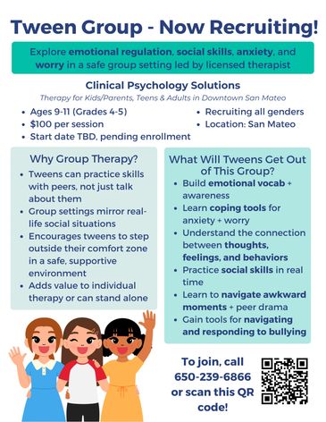 A therapy group for tweens ages 9-11 (4th-5th grade) focused on helping tweens practice social skills and learn new tools through casual and fun interactions with peers in real time.